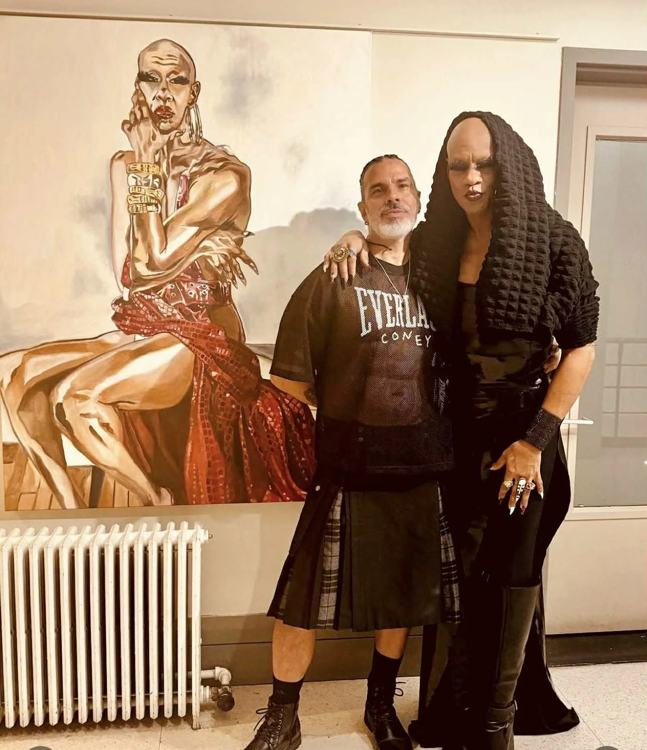 In the last year my studio space has changed somewhat drastically. Since I moved into my partner’s Brooklyn apartment, my studio space is smaller, sparer, and stranger. In Queens, where I lived alone, my whole apartment was my studio so my portrait work had the run of the place. I had my sittings perch on my wine-colored futon, or lay on the deep brown covers of my bed, or sit on the red, yellow, and orange geometric-patterned rug on the floor. There, in my Queens apartment, I arranged things that were in the room around my sittings. For Michelle, I placed several of my pottery pieces at her feet with a dagger sticking out of one of the pots. For John, I laid a katana across his reclining body. I surrounded Jasmine with books and then ripped pages out of one book we selected together and then I scattered the torn pages around her. I scattered pink and white carnations around and on Caleb that I plucked out of a vase on the windowsill.
